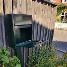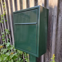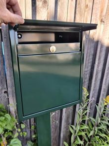 Postkassen er fremstillet af 1,0 mm rustfrit stål, type AISI 430, en ferritisk legering med 16% krom. Dette materiale er særligt velegnet til mildt korrosive miljøer, hvilket sikrer en lang levetid. Den smukke Racing Green pulverlakering i RAL6009 giver ikke kun et elegant og moderne udtryk, men beskytter også mod vejr og vind.