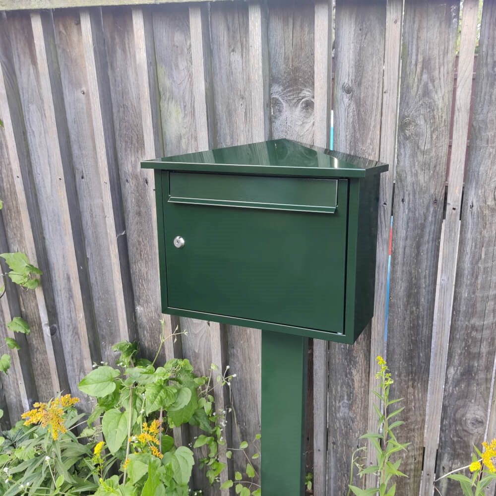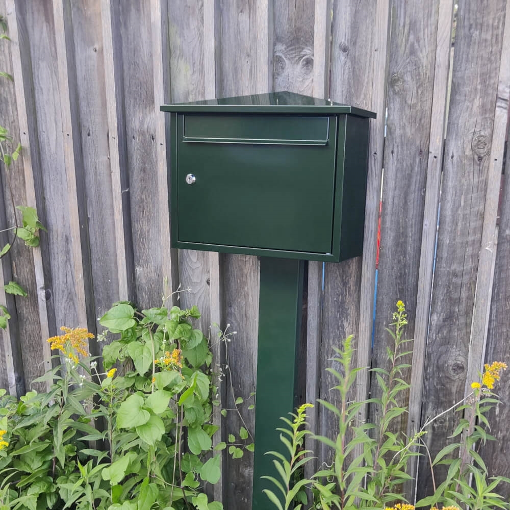 Postkassens elegante afvalmede top og dybe grønne farve byder gæster velkommen med ynde. Den komplementerer både romantiske haver med roser og lavendler - og minimalistiske forhaver med lav beplantning og rene linjer.