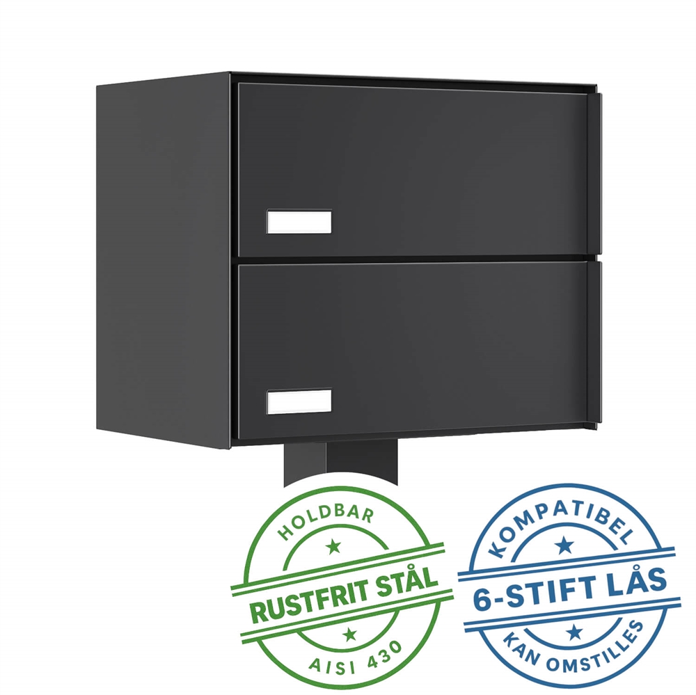 Vores dobbelte postkassesystemer er udviklet specifikt til behovene i dobbelthuse og små boligkomplekser. Hvert system er lavet af pulverlakeret rustfrit stål, et robust materiale, der er både holdbart og vejrbestandigt. Den skjulte lås sikrer, at din post opbevares sikkert og beskytter mod uautoriseret adgang.