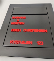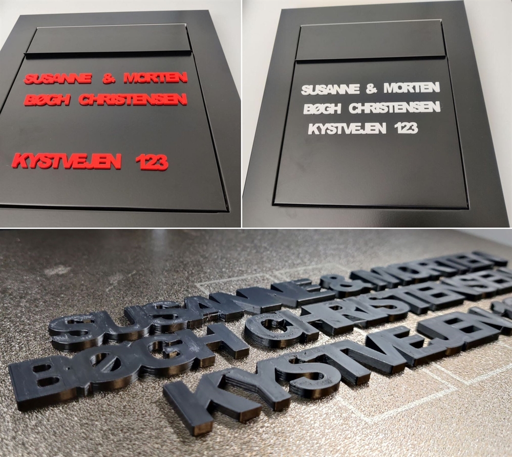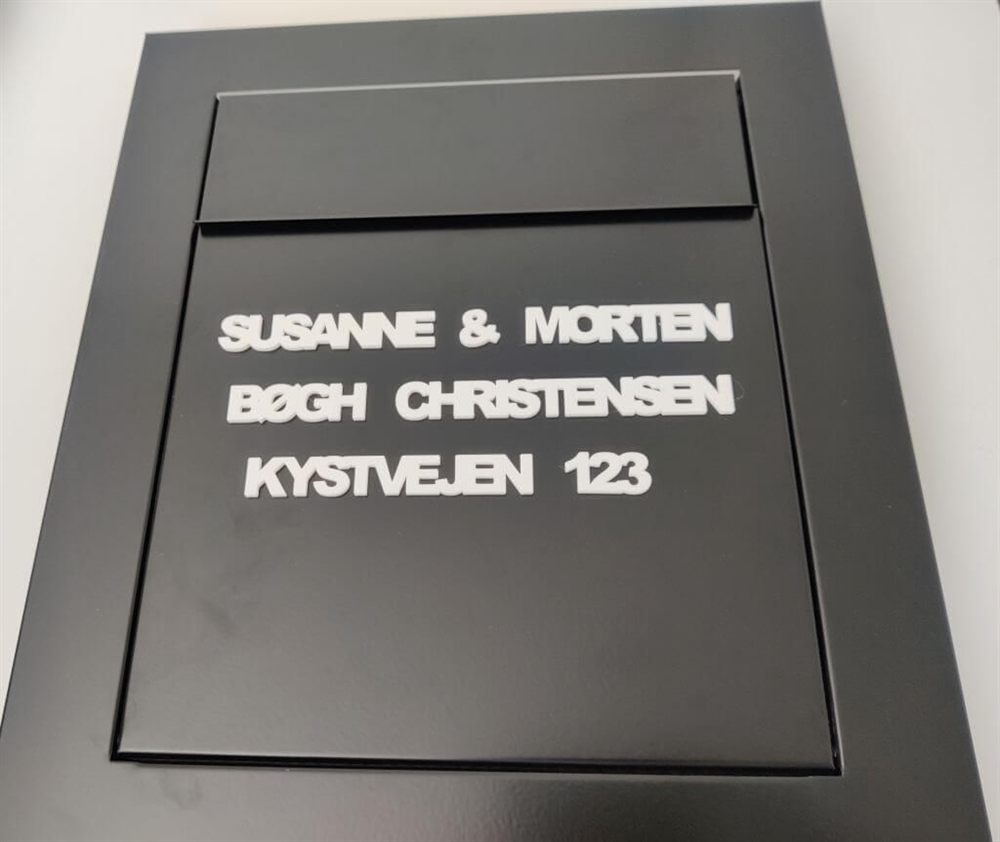 Vi tilbyder bogstaver med hvid, sort eller rød tekst, alle med en højde på 20 mm og fremstillet i 3 mm tykt ASA-thermoplast – et materiale, der både ser flot ud og tåler selv det hårdeste danske vejr.