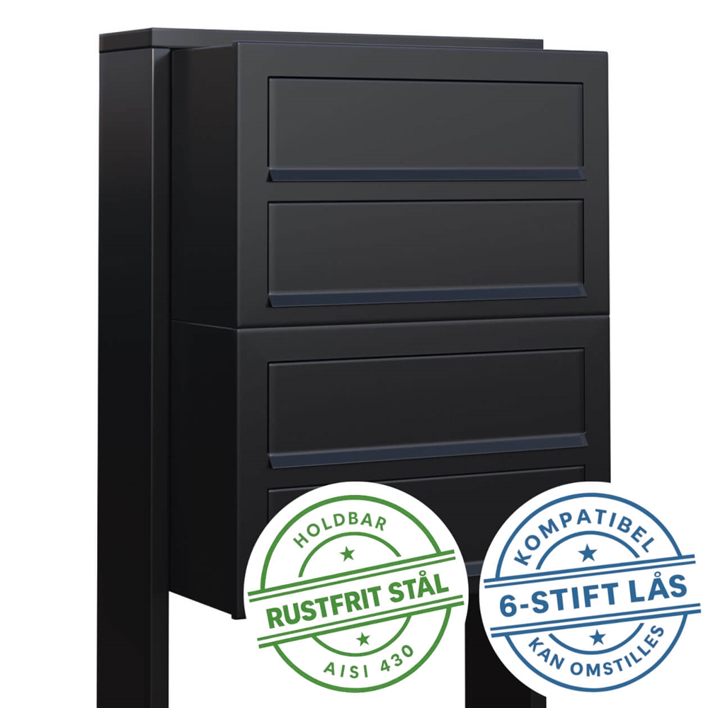 Sort Postkasseanlæg med Stander - 4 enheder - CUBE Exclusive - Rustfrit stål